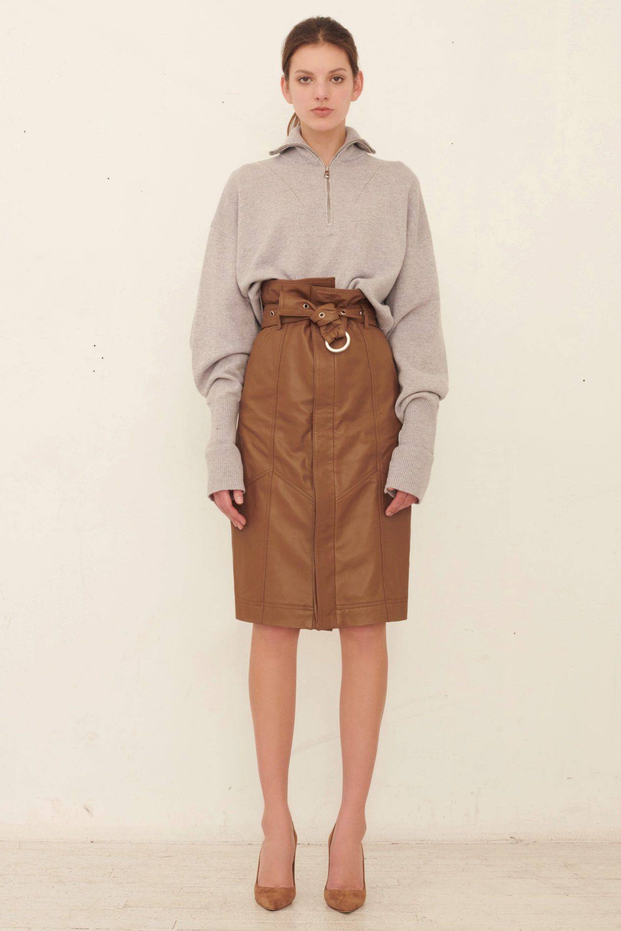 На фотосессию она представила лук из классической кожаной узкой юбки и опять-таки с объёмным свитером (коллекция Lulli sur la toile). Её цветовое сочетание более консервативно: чёрный низ и бежевый верх. Надо отдать должное простоте образа и добротности исполнения кожаной юбки.