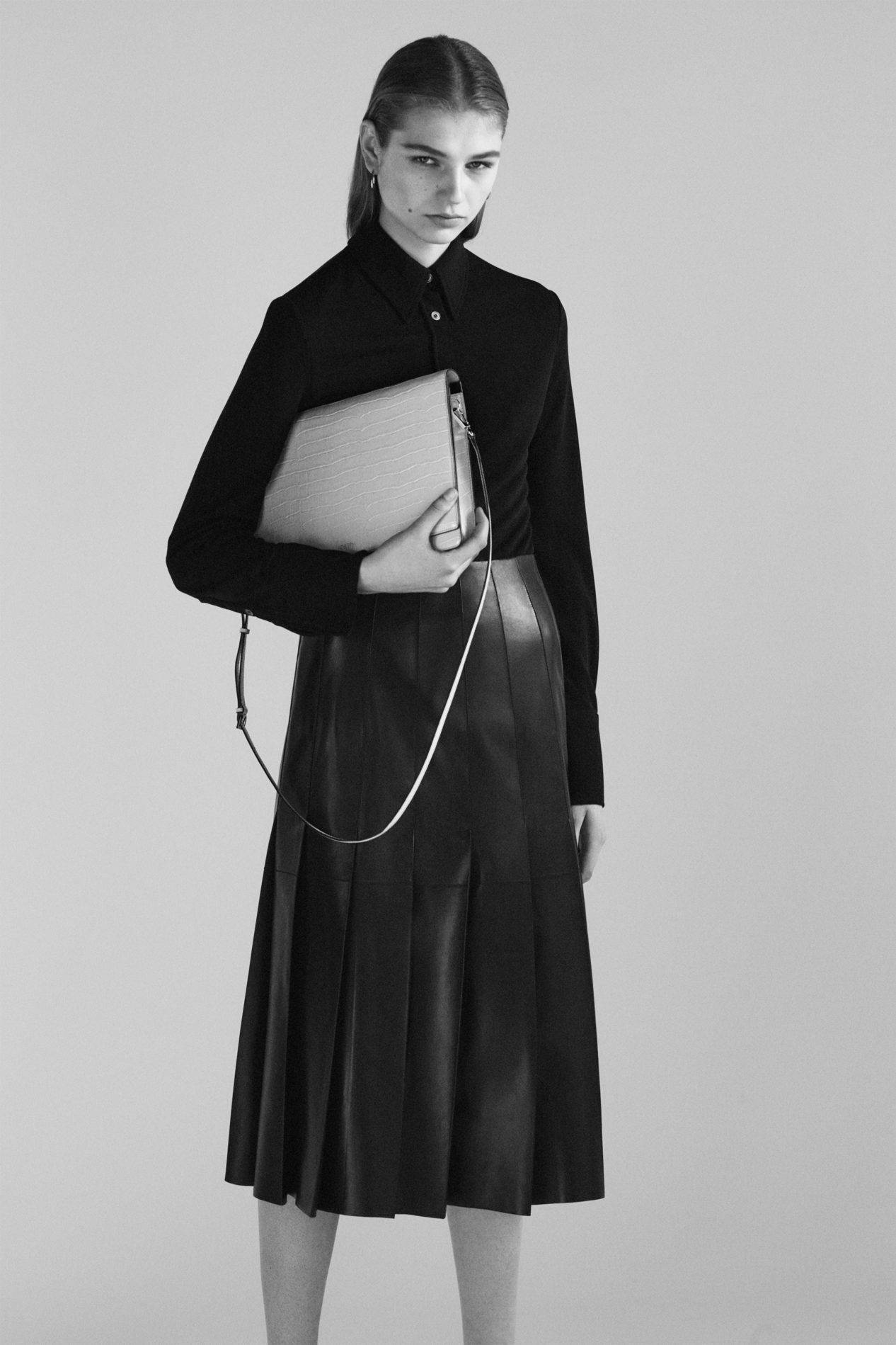 Подобрав к кожаной юбке рубашку или блузку в спокойных, пастельных тонах, с длинным рукавом, туфли на невысоком каблуке и клатч – можно создать спокойный комплект для повседневного использования.