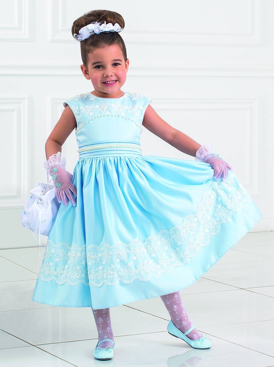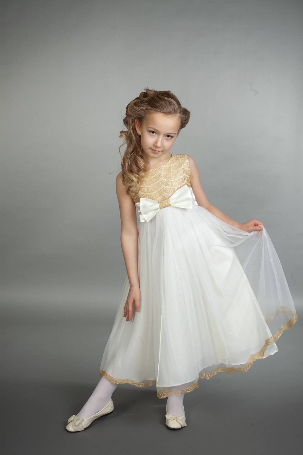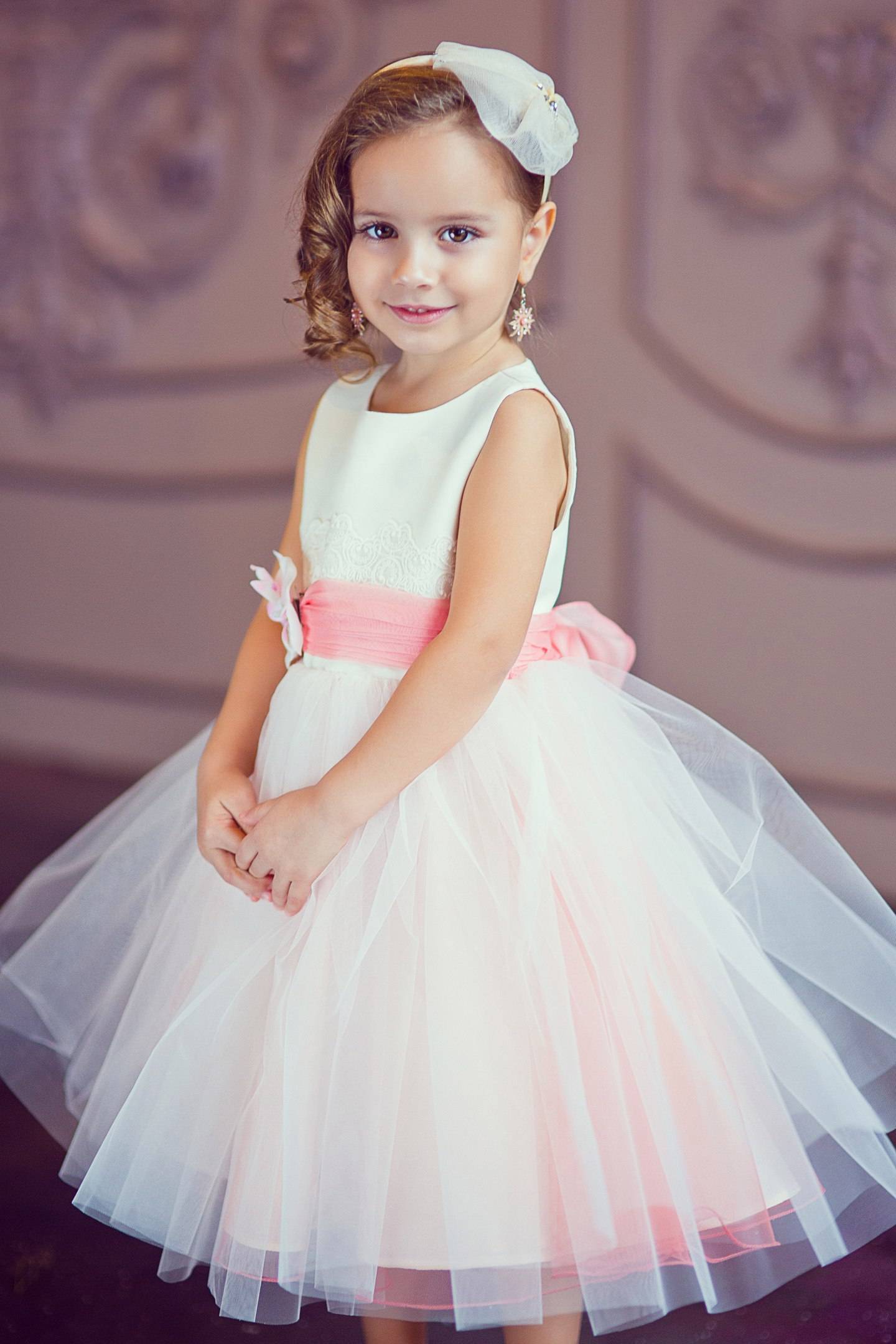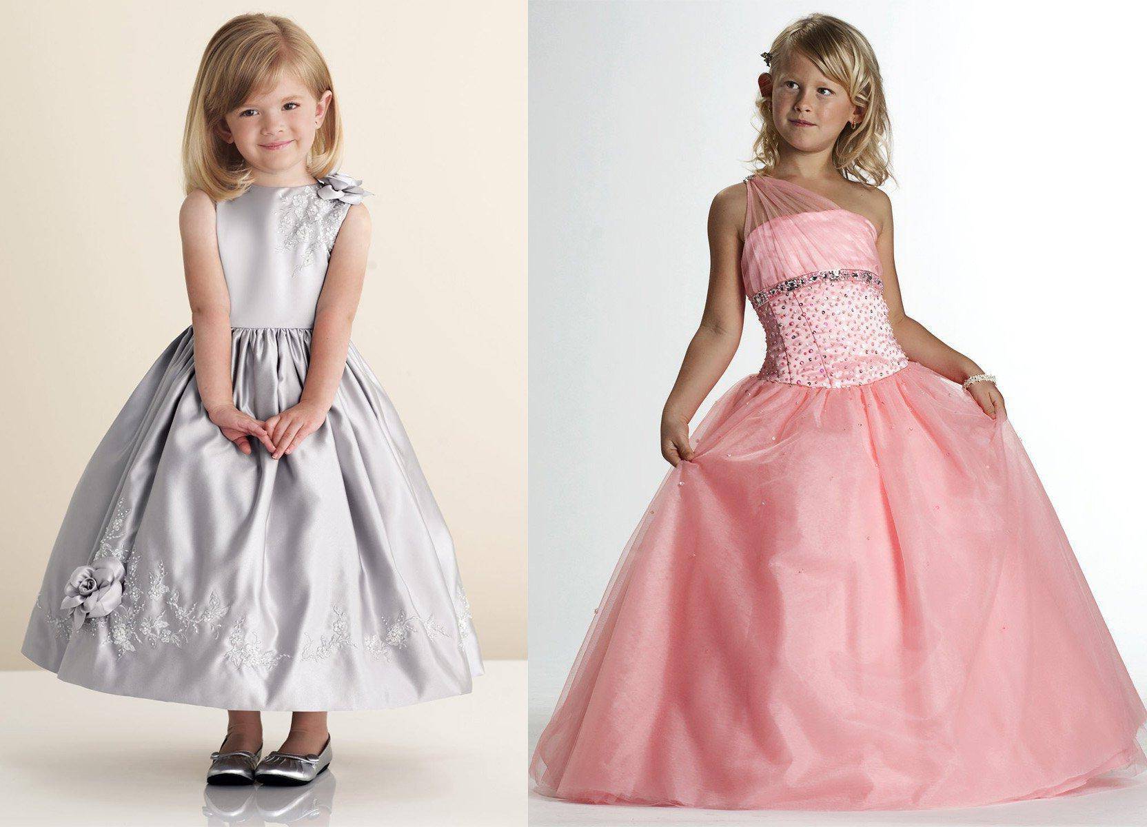 Детские платья с небольшим рукавом или на бретельках, может быть длинным и коротким, когда юбка до середины колена превращается сзади в элегантный шлейф. Лиф приталенный, украшен стразами, бисером, вышивкой. На спине может присутствовать V-образный вырез.