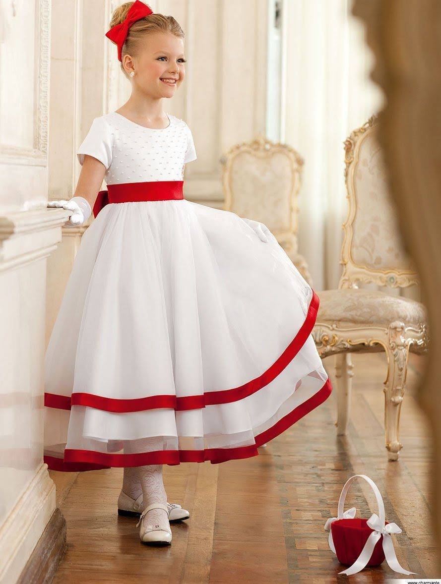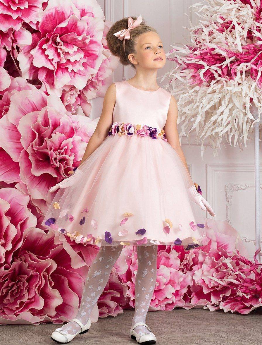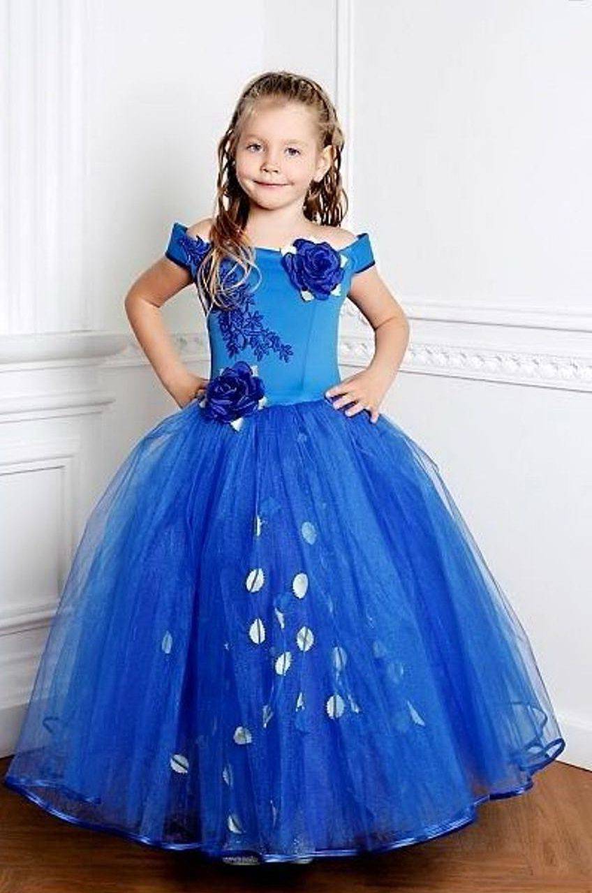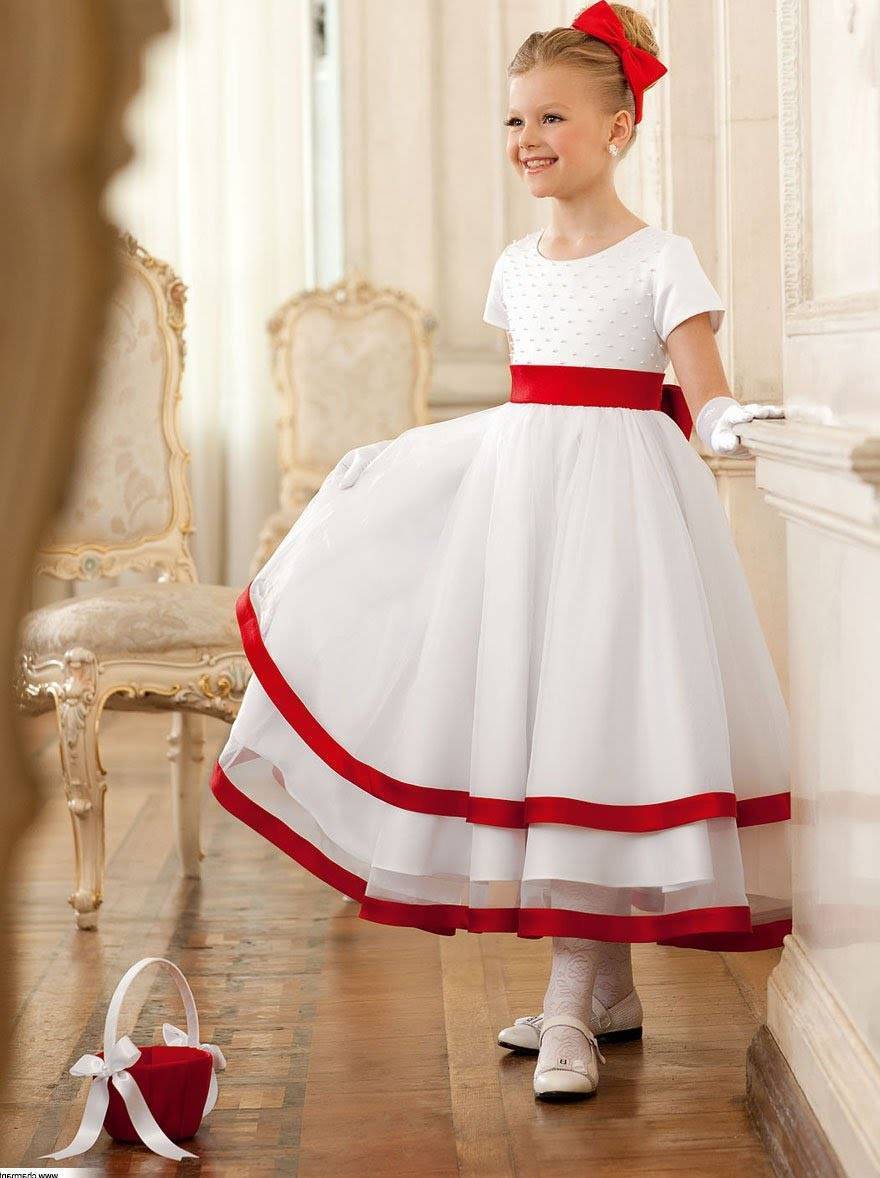 Детские платья с небольшим рукавом или на бретельках, может быть длинным и коротким, когда юбка до середины колена превращается сзади в элегантный шлейф. Лиф приталенный, украшен стразами, бисером, вышивкой. На спине может присутствовать V-образный вырез.