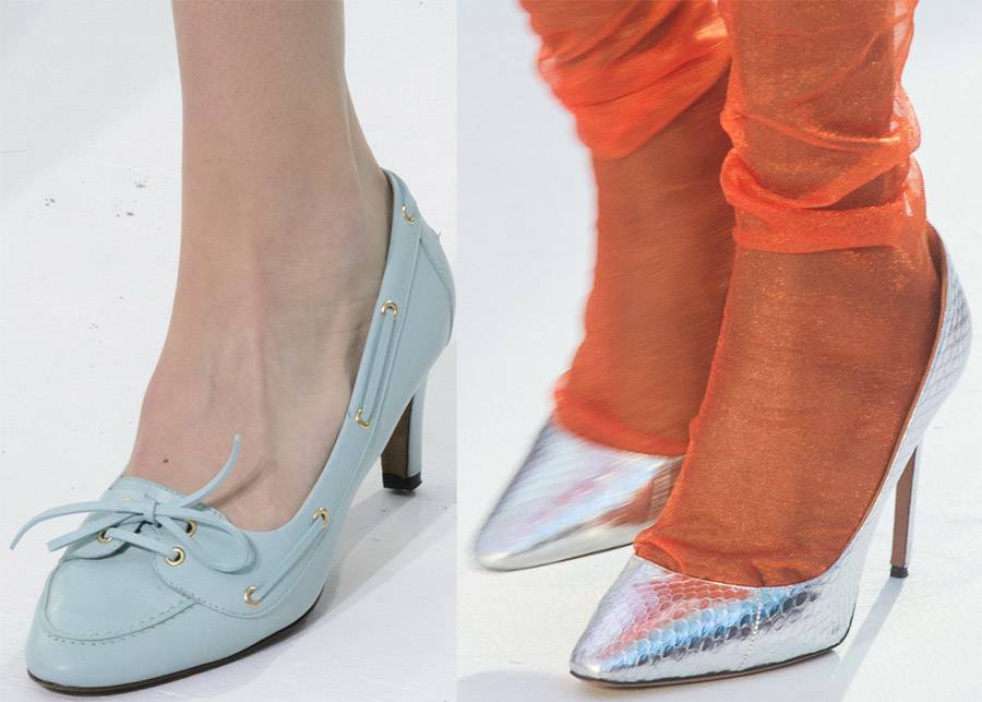 Металлический блеск сохранит свою актуальность в предстоящем сезоне. Туфли серебряного и золотого цвета дополнят строгий образ. На них можно сделать акцент, если девушка выбирает однотонное платье простого кроя, строгий костюм или прямые джинсы.