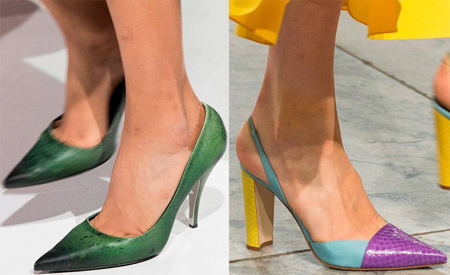 Желтый цвет в предстоящем сезоне будет актуален во всех оттенках. На подиумах были представлены яркие туфли на низком каблуке, «кислотные» сандалии на тракторной подошве, а также горчичные остроносые туфли на шпильках.