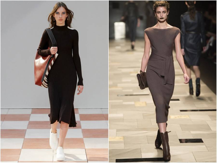 - плотные материалы можете сочетать с колготками черного или коричневого цвета, в зависимости от обуви.