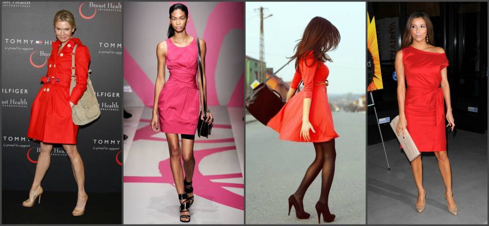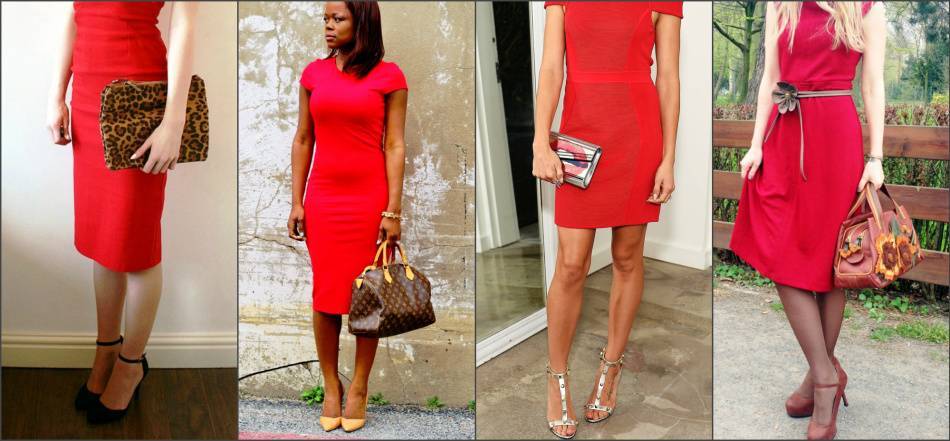 Постарайтесь не сочетать в одном образе несколько оттенков красного — это смотрится хорошо только в исключительных случаях, когда образ хорошо продуман. Обычно же не стоит надевать алые туфли или брать коралловую сумку под бордовое платье. Это же правило относится и к насыщенным розовым тонам. Бледно-розовые аксессуары часто гармонично смотрятся с красным платьем, но темные розовые оттенки или фуксия будут неуместны.