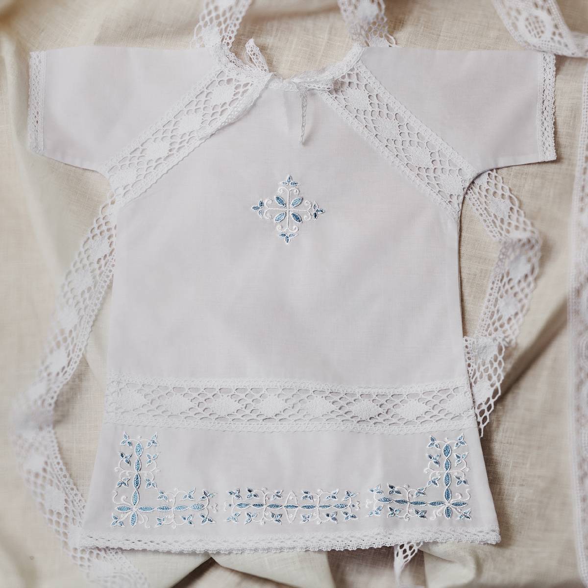 Этот элемент крестильного набора должен быть изготовлен из качественного материала. Оттенок рубашки должен быть белый. Именно этот цвет символизирует чистоту и невинности. Можно допустить вышивку и кружев. Но только цвет отделки может быть голубого цвета.