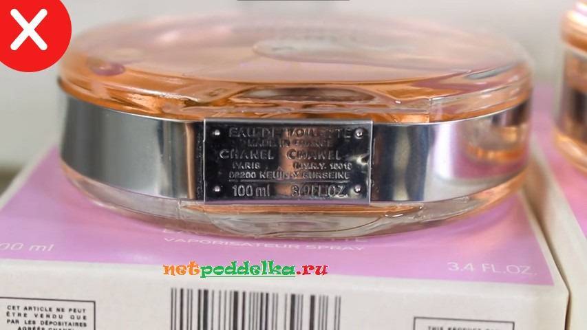 Подлинники от Шанель имеют отделку из металла на пузырьке. Металл обрабатывается до последней кромки и имеет полировку. На подделке применяется тонкий металл с заусенцами. Также на пульверизаторе у фальшивок вставляется тонкое кольцо. У оригинальных духов такого кольца не бывает.