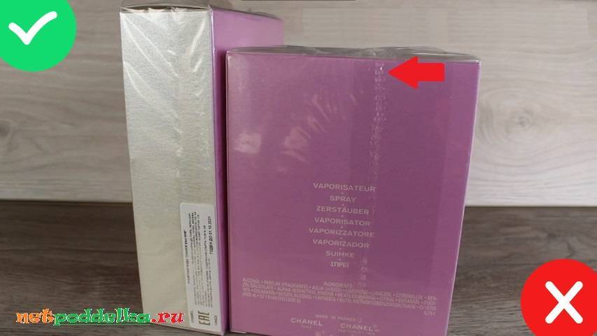 Цвет коробки оригинала также отличается от фальшивки. Надписи с ошибками совершенно недопустимы. Кроме надписи все подлинники Шанель покрыты пленкой. Полиэтилен должен иметь среднюю толщину с отсутствием неровностей. Пленка скрепляется термальным способом и оставляет швы сверху и снизу. А целлофан на подделке скрепляется клеем и имеет грубую поверхность.
