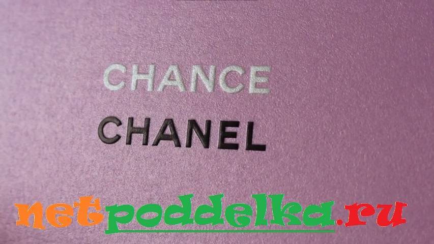 Фирменная упаковка имеет рельефную надпись Chanel Chance. У фальшивого парфюма буквы просто нанесены краской. При этом могут наблюдаться орфографические ошибки и дефекты полиграфии. На некоторых подделках буквы вдавлены методом тиснения.