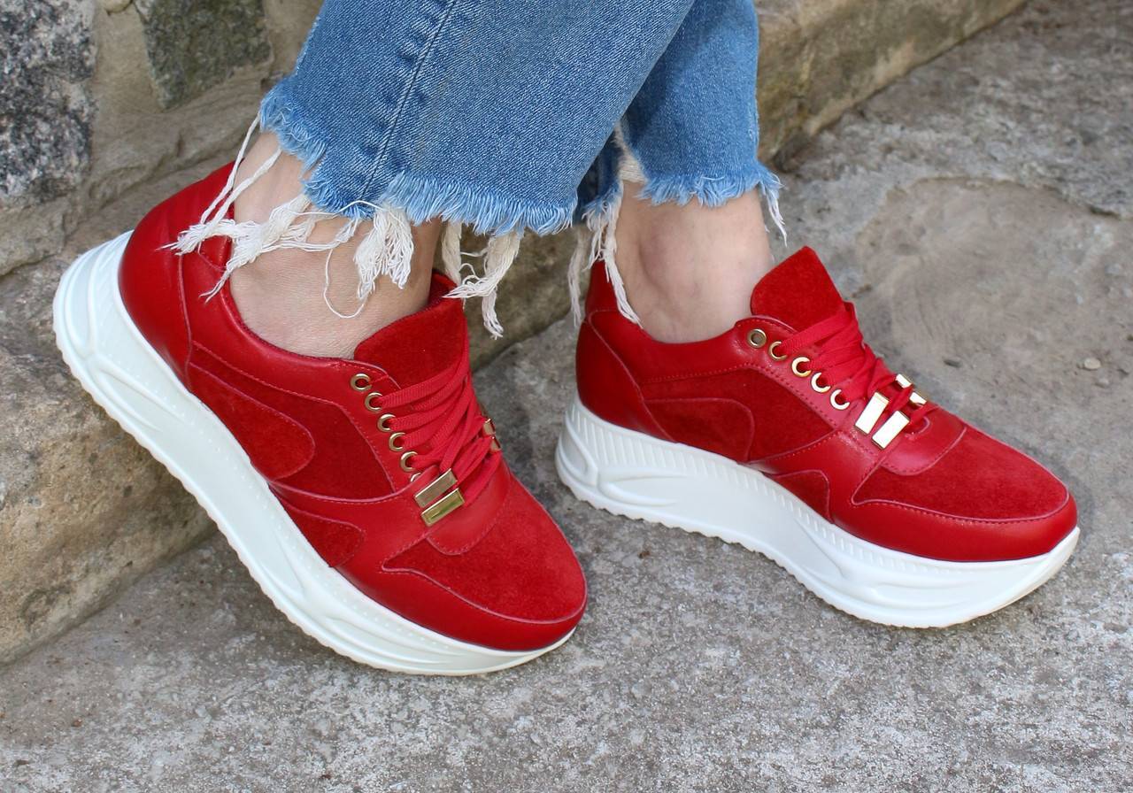 - Красные кроссовки говорят о дерзости своей обладательницы. Они становятся индивидуальным акцентом в модном образе. Его можно дополнить аксессуарами такого же или близкого оттенка.