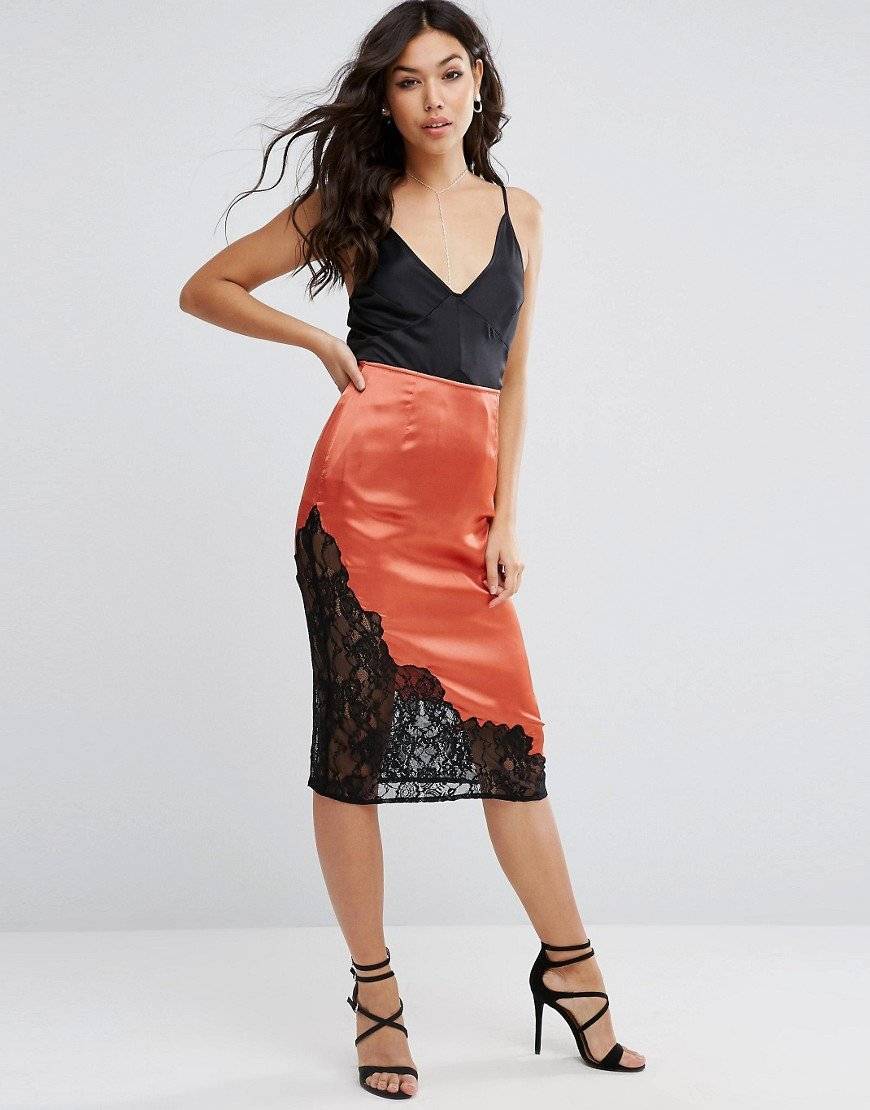 Фасон кружевной юбки карандаш может быть с завышенной талией, такие модели отлично смотрятся с блузками и обувью на каблуке или короткими топами. И с низкой линией талии, открывающей пупок и кубики пресса, такую модель можно носить под боди и комбидресс.