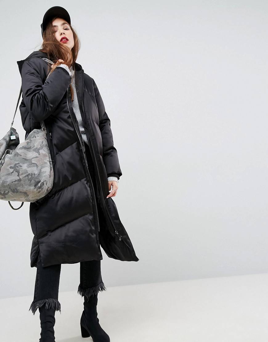 Девушки, которые любят привлекать к себе внимание окружающих, обязательно возьмут себе на заметку колоритный лук, в котором черная зимняя куртка сочетается с яркой одеждой или аксессуарами. В зависимости от ситуации, обувайте белые кроссовки, черные кеды, туфли-лодочки, ботинки или ботильоны