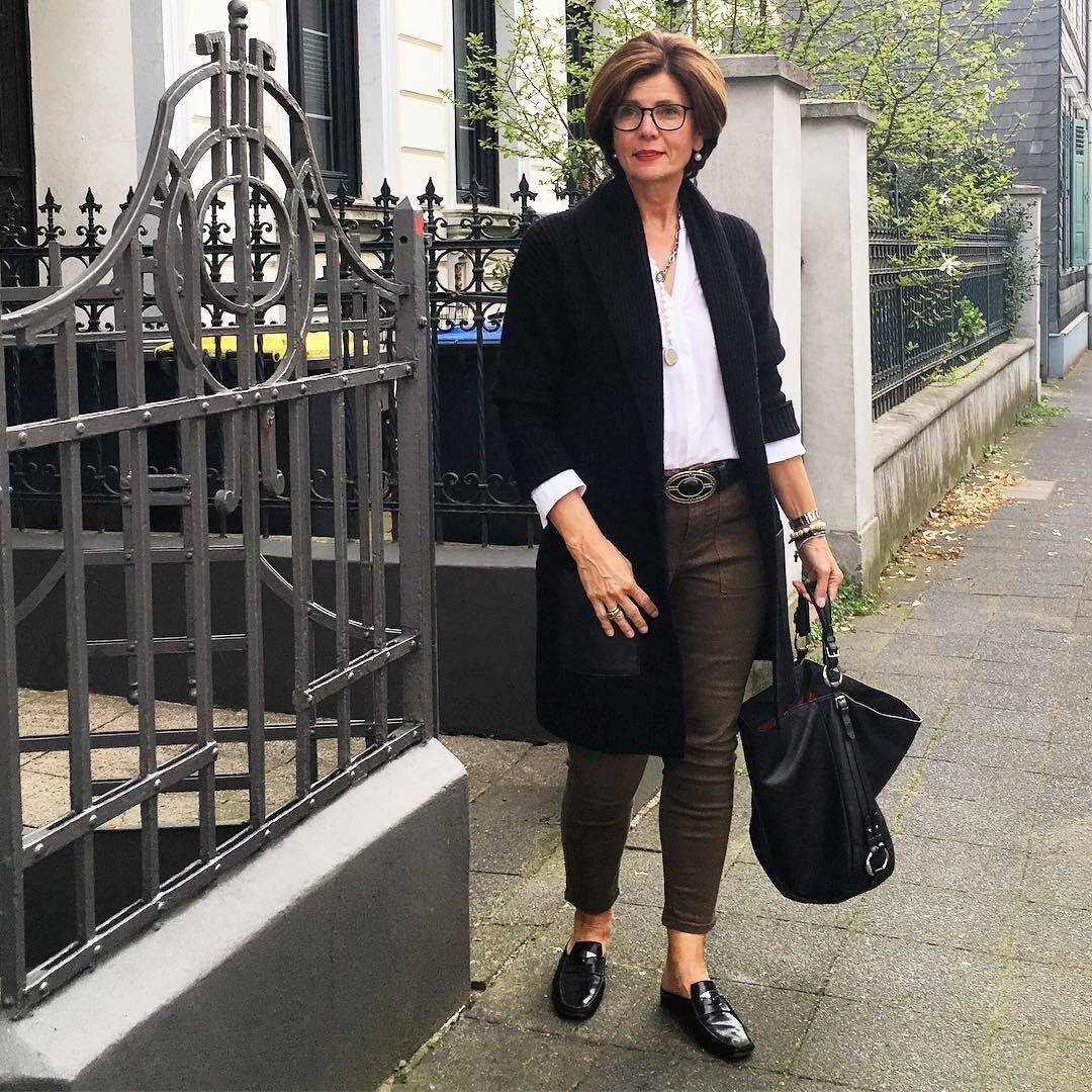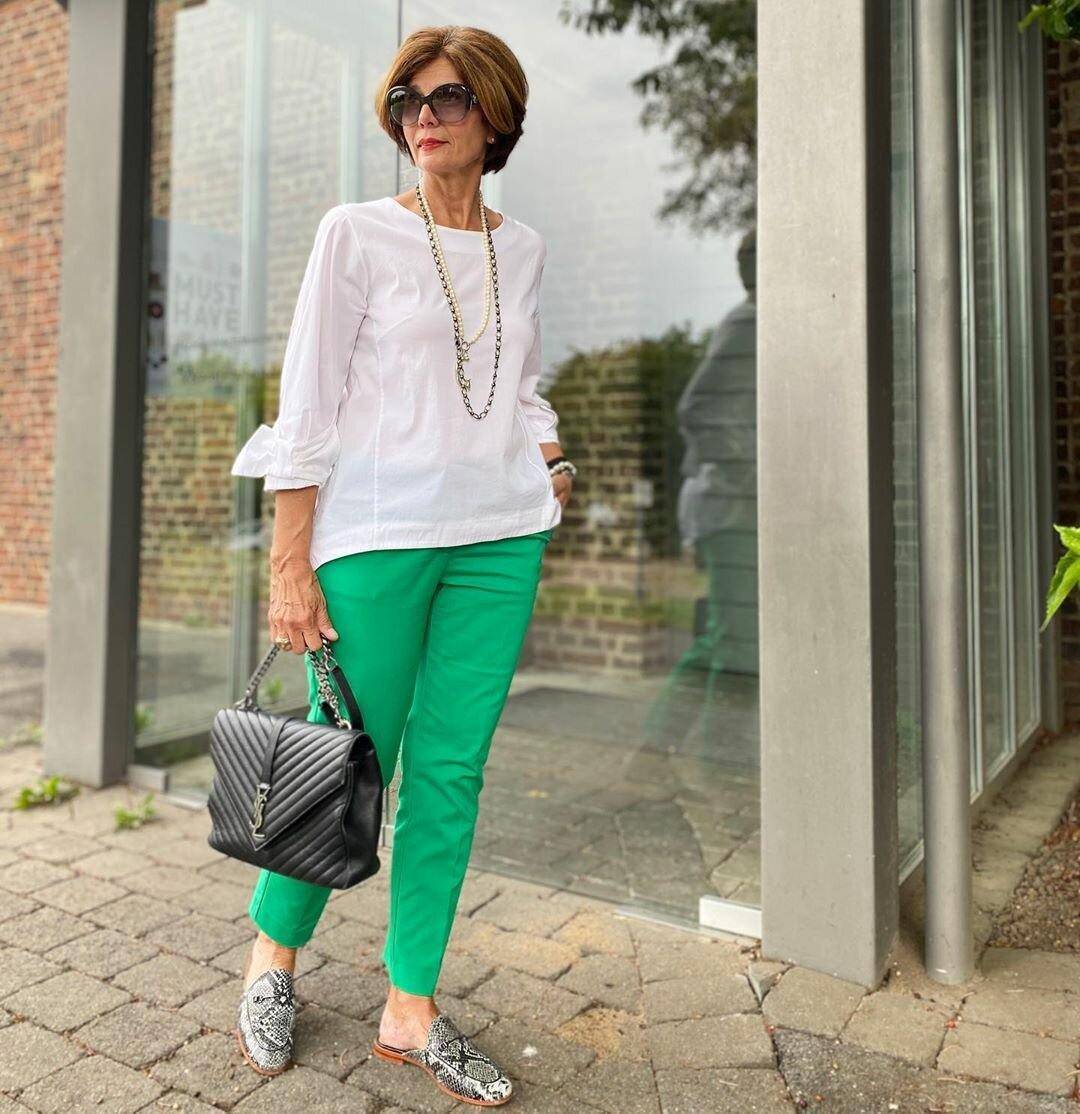 Поскольку брюки во всех своих интерпретациях уже давно являются неотъемлемой частью женского гардероба, мы поставили подобный вид одежды во главе списка. Итак, при выборе классических брюк дамам, переступившим пятидесятилетний рубеж, рекомендовано отдавать предпочтение приталенным моделям прямого либо слегка расклешённого к низу кроя. Их актуально сочетать с рубашками и футболками, удлинёнными кардиганами или пиджаками. Что касается джинсов, то для роли базовой составляющей идеально подходят тёмно-синие либо чёрные модели с прямыми, укороченными либо зауженными штанинами.
