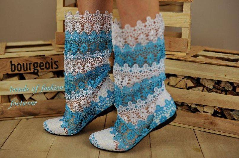Такая обувь может изготавливаться из тонкого кружева, а может вывязываться из плотных нитей. В последнем случае она больше подойдет для слегка прохладного летнего вечера.