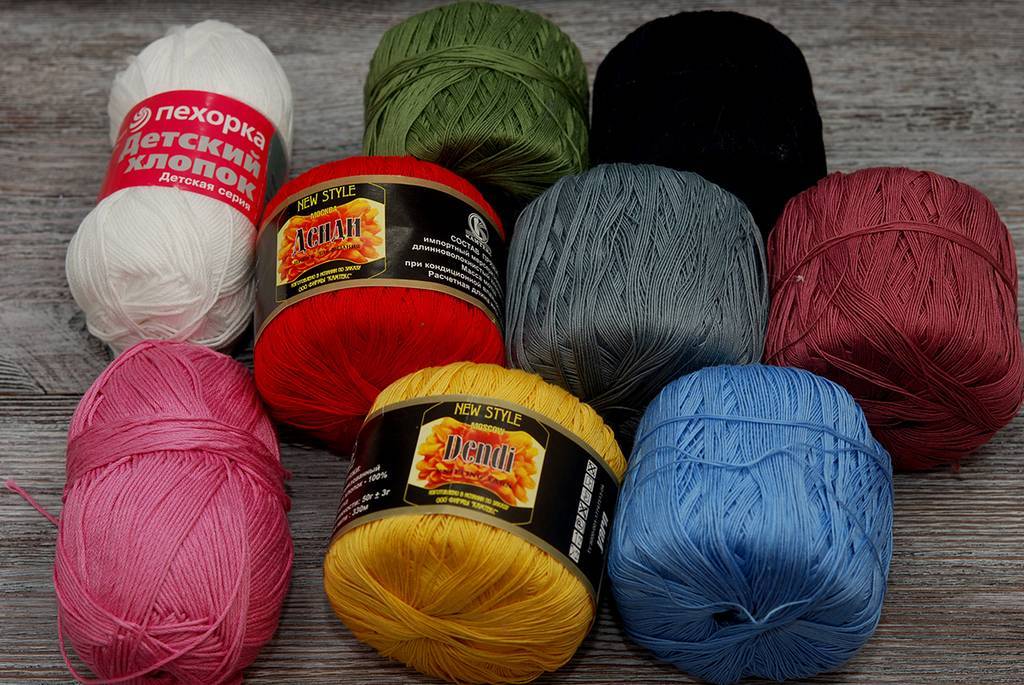 - Хлопковая пряжа разных цветов (на возраст 6 месяцев необходимо 100 г пряжи)