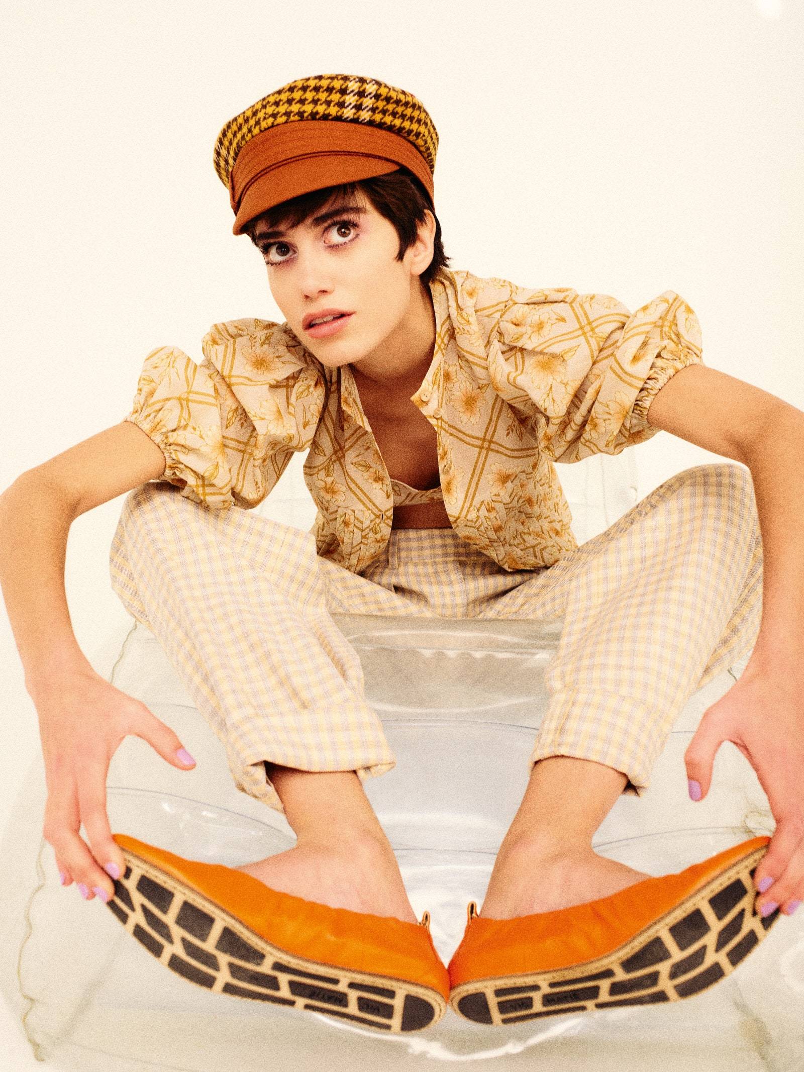 Льняные блузка и бра, все Alberta Ferretti; хлопковые брюки, Acne Studios; кожаные балетки, Vic Matié; кепка из твида и кожи, Ruslan Baginskiy
