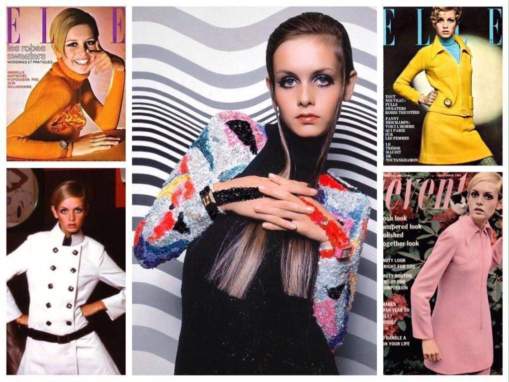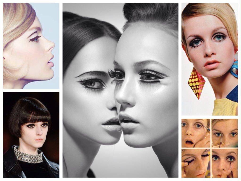Мода в 60-х претерпела кардинальные изменения. Теперь особенно цениться стали не женские фигуры из 50-х — пышные бедра и грудь, узкая талия — а очень худощавые. Ярким пример — известная модель того времени Твигги. Она стала первой моделью с 40 размером одежды, хотя тенденция сохранилась и после нее. Ее образ инфантильной девушки в коротких платьях произвел настоящий фурор. Еще одна ее изюминка — ярко подведенные огромные глаза.