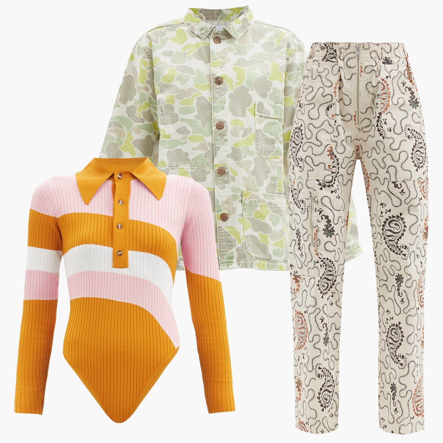 Боди-поло Hera, Dodo Bar Or, 30060 рублей, matchesfashion.com; куртка из денима, Raey, 26520 рублей; хлопковые брюки Noferis, Isabel Marant Étoile, 31150 рублей, matchesfashion.com