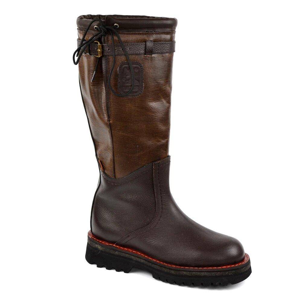 Высокое голенище (34 см от пола) в обхвате 35-40 см. Размерный ряд начинается с 40 и заканчивается 45. Лаконичный сдержанный дизайн предполагает только один цвет – коричневый. Общий вес пары – 2.2 кг.