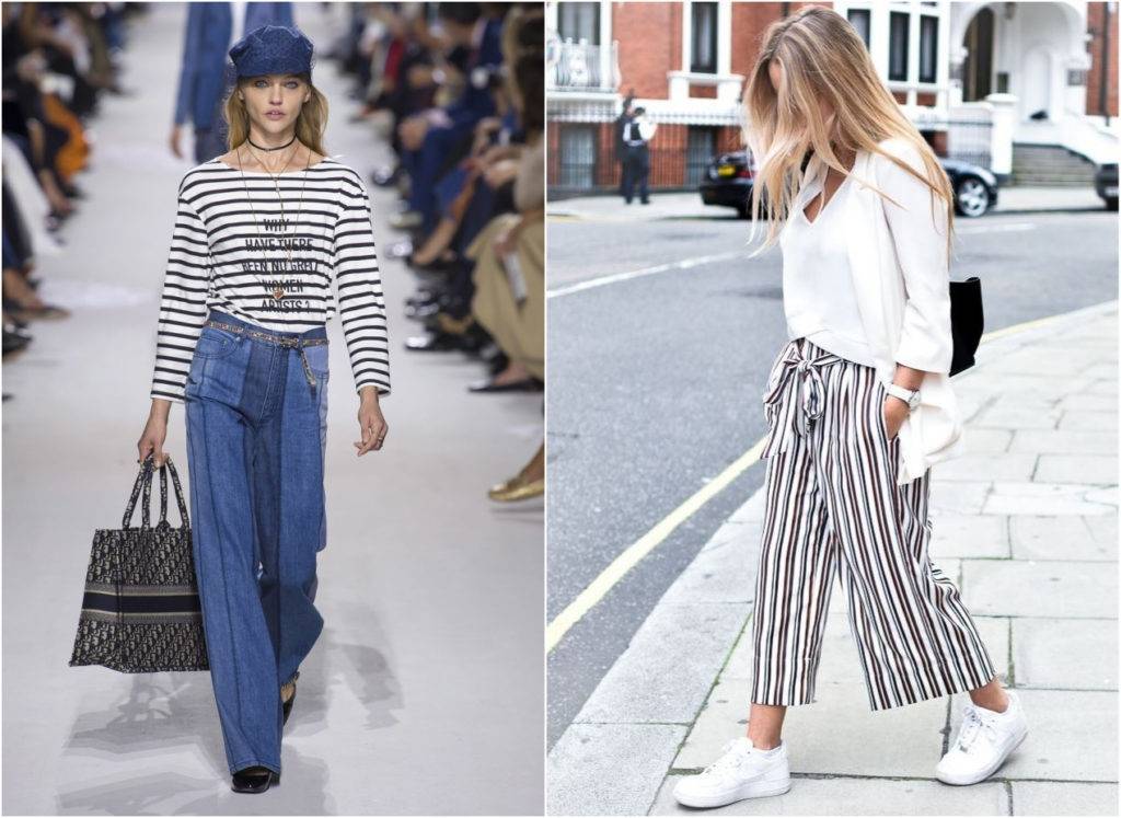 Для низа предпочтительно выбирать наряды силуэта клеш. Актуальные свободные брюки, однотонные кюлоты или штаны с лампасами подчеркнут образ в морском стиле. Отличным вариантом также станут штаны-чинос или укороченные голубые джинсы. Дизайнеры предлагают модели с завышенной талией, также могут быть выполнены из денима, льна или хлопка. Дополните наряд небольшой яркой сумкой, обувью на танкетке или широким кожаным поясом.