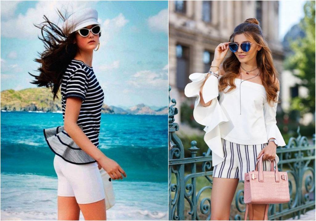 Являясь главной составляющей модных летних образов, классические шорты находят свое применение в морской тематике. Широкие, выполненные из натурального материала шорты гармонично сочетаются с тельняшкой, рубашкой или топом в морском стиле. Самыми актуальными моделями являются бермуды нюдовых оттенков, джинсовые шорты с завышенной талией, а также высокие хлопковые шорты и даже велосипедки.