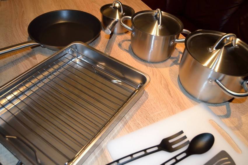 Некоторые кухонные наборы включают в себя кухонные принадлежности – обычно лопатку и большую ложку. И некоторые универсальные наборы также содержат вилки. Однако большинство людей склонны пользоваться отдельными столовыми приборами и посудой.