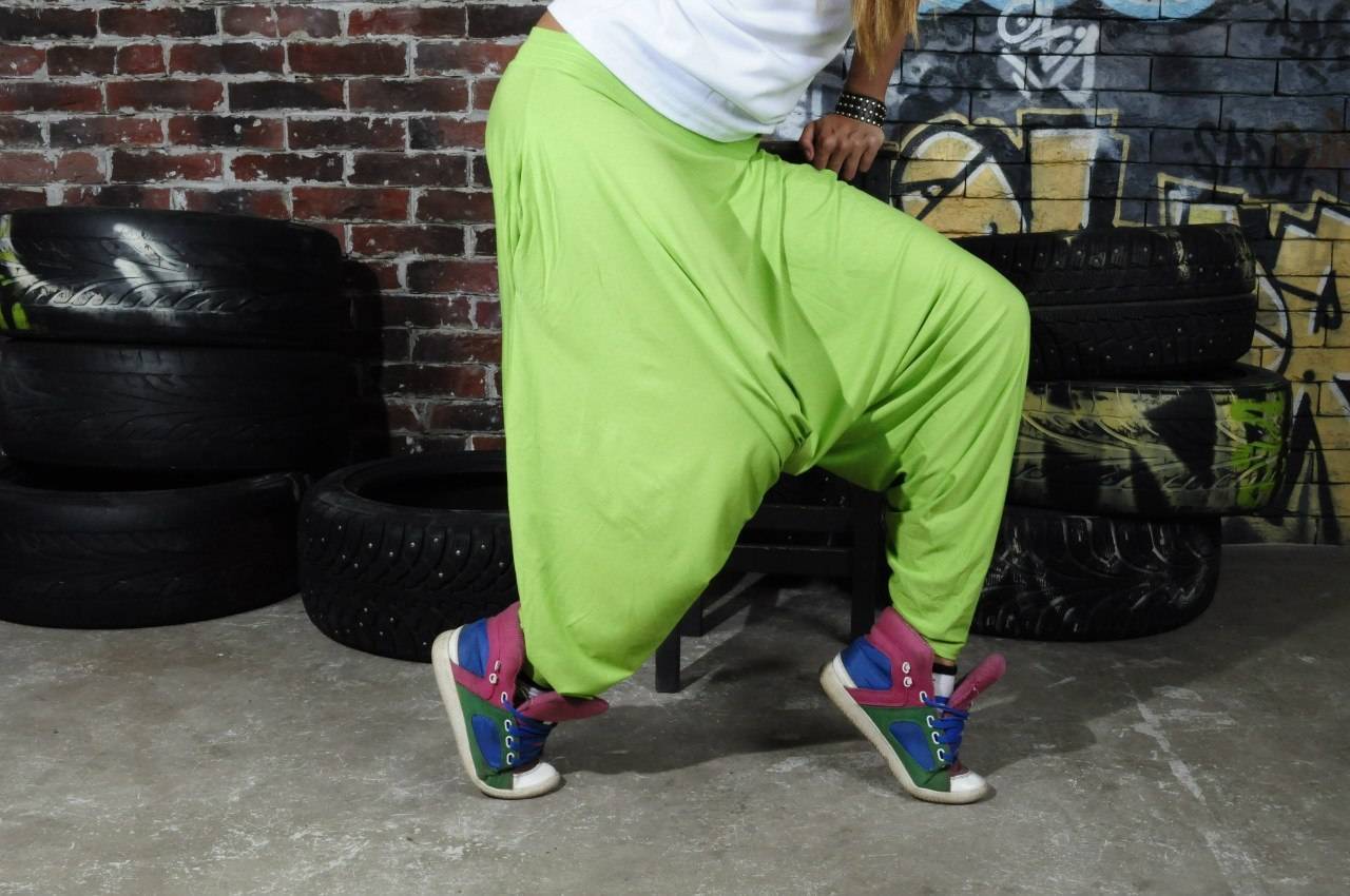 Излюбленным видом одежды прогрессивных парней и девчонок являются свободные штаны — трубы. Они не стесняют движения при исполнении сложных трюков в танцевальном стиле хип-хоп. Штаны принято немного приспускать и дополнять ремнем с крупной и эффектной бляхой.