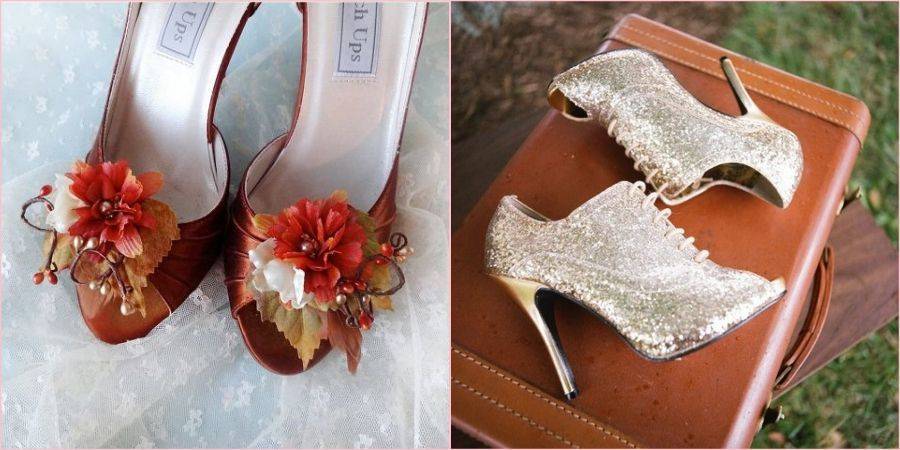 Пара обуви, как и наряд, может быть необязательно белоснежной, а любого понравившегося цвета, вписывающегося в общее оформление торжества и образ молодых.