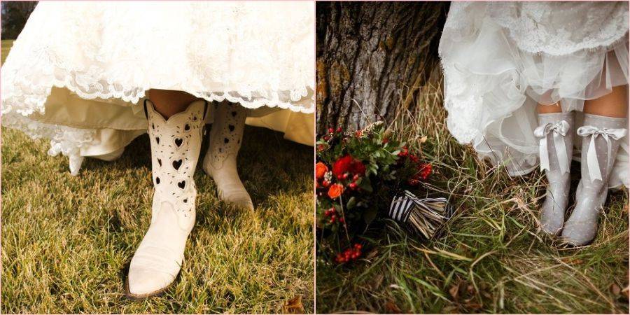 - А вот в конце сезона уместно выбрать ботильоны или даже полусапожки. Оригинальным невестам наверняка понравятся яркие резиновые или ковбойские сапоги, в которых замечательно будет устроить интересную фотосессию на осенней природе, особенно если намечается дождик.