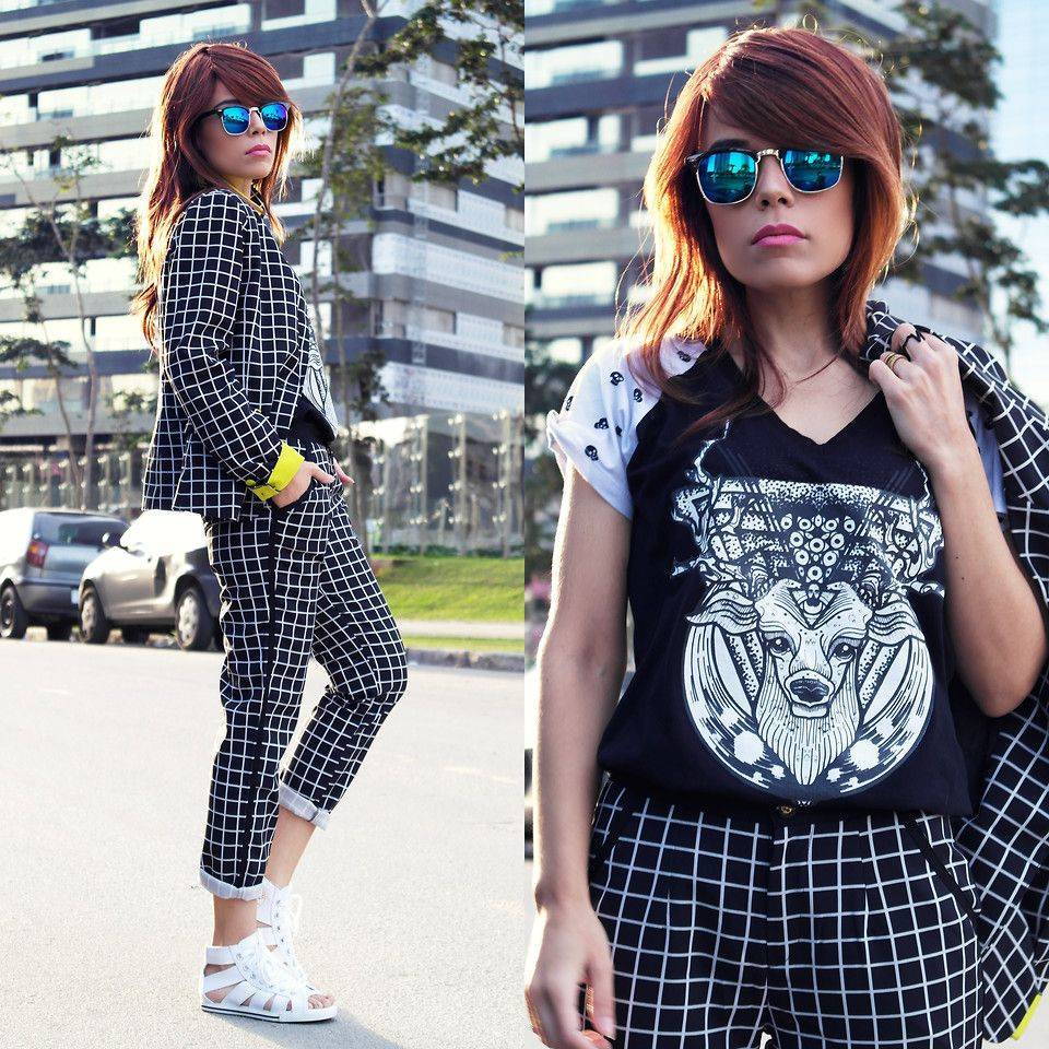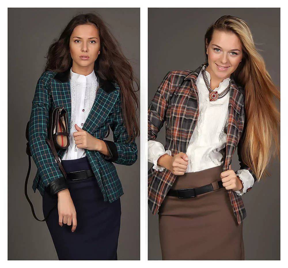 Это сочетание может составить и деловой, и каждодневный, и выходной комплект для праздничного мероприятия. В сочетании с балетками и другой удобной обувью отлично подойдёт для длительных прогулок, экскурсий и даже путешествий. Пиджак до середины бедра подойдёт прямым и обтягивающим моделям брюк, а клёш будет хорошо смотреться с укороченным клетчатым жакетом.