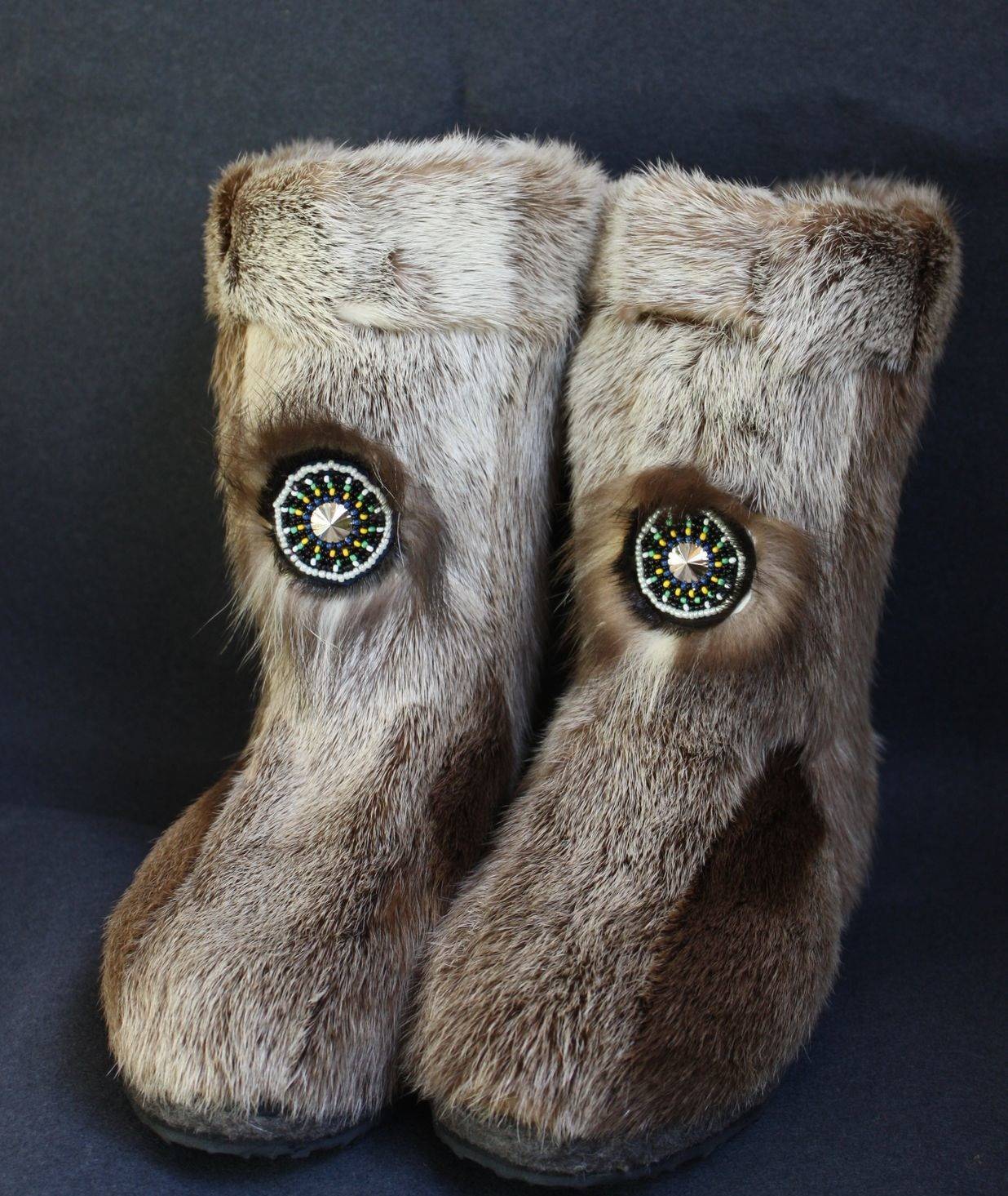 Большую популярность имеют унты, выполненные в технике меховой мозаики. Ручная работа высшего мастерства по соединению кусков оленьей шкуры разных цветов. Из светлых и темных меховых отрезов создают неповторимые узоры. Женские сапоги украшают лентами, камнями или бисером.
