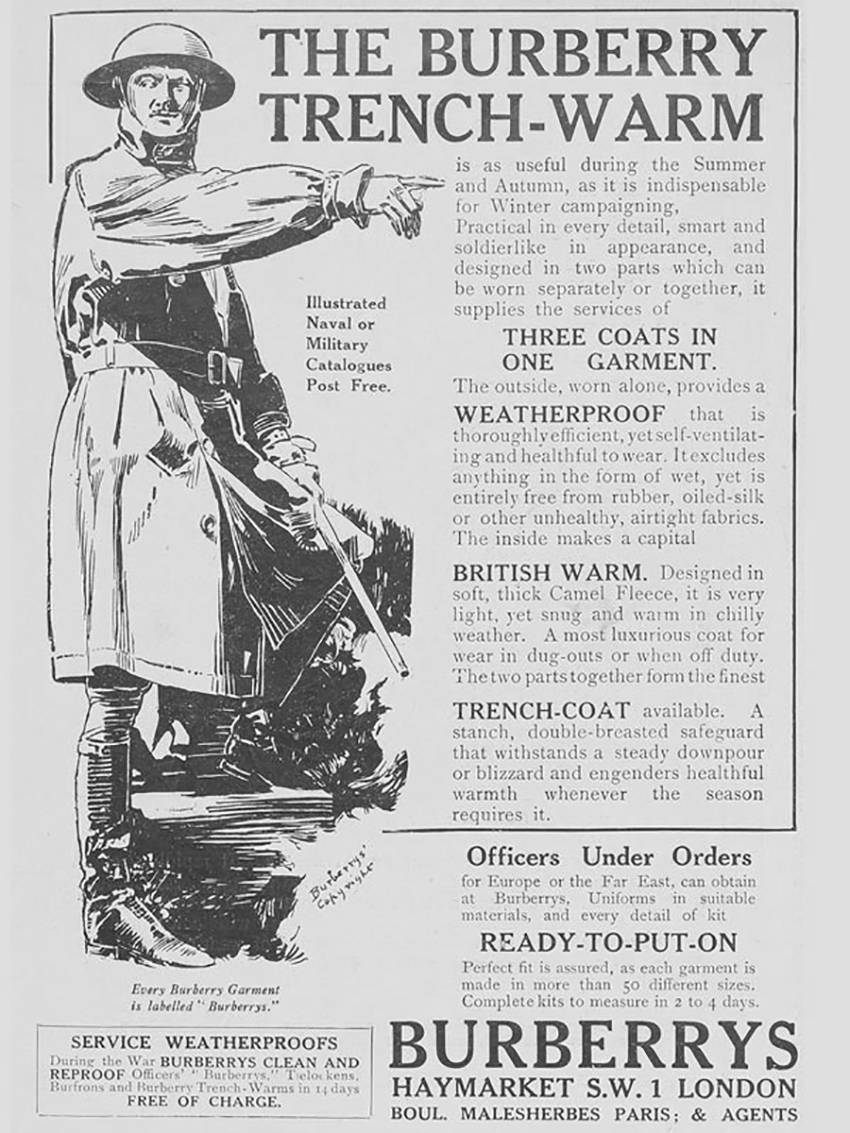 Автором траншейного пальто был знаменитый модельер Томас Бёрберри, плащ из ткани с водонепроницаемой пропиткой служил униформой британским солдатам в годы Первой мировой войны.