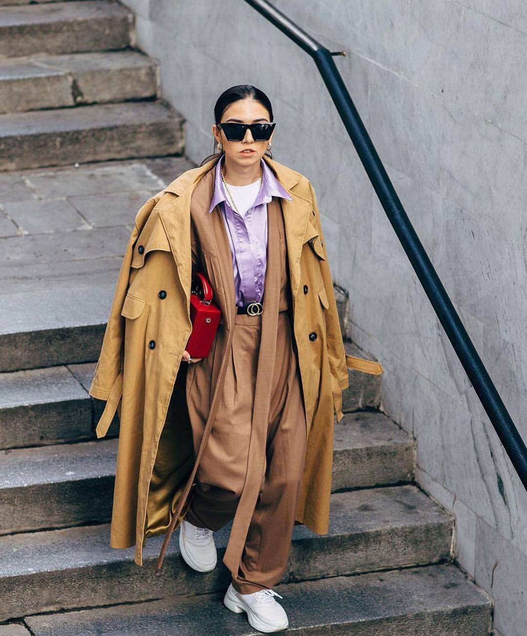 Плащ бежевого оттенка стандартной длины – по колено, чуть выше или чуть ниже – уместен практически в любом контексте. Его необязательно использовать в рамках делового, сдержанного или ретронаправления. Он сумеет вписаться даже в ансамбль, состоящий из спортивных брюк, кофты с капюшоном и кроссовок.