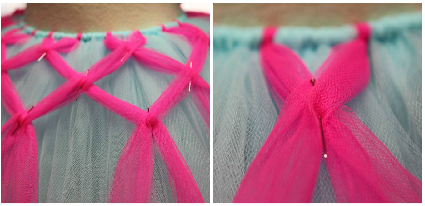 - Начните надевать фатин на топ, но только не в первом ряду, как мы это делали в предыдущем мастер-классе, а во вторую строчку.