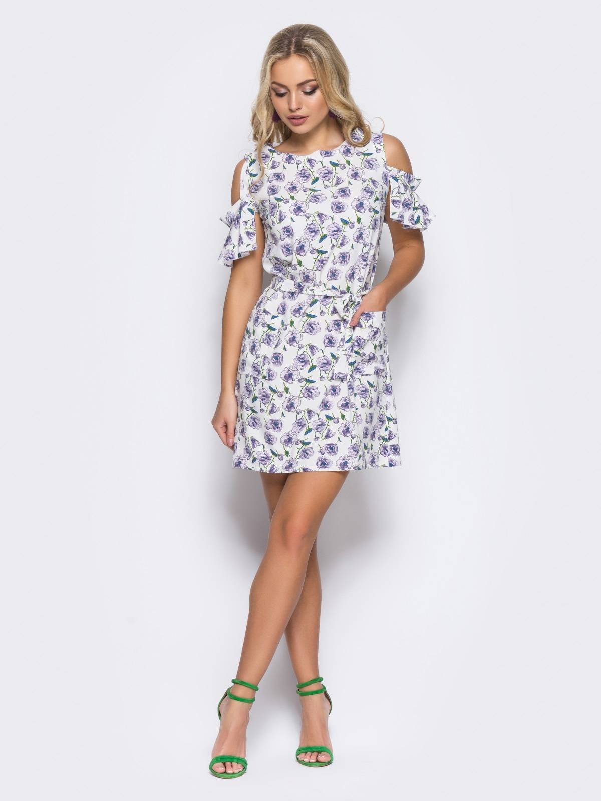 Летнее платье-крестьянка с открытой линией плеч и воланом. Сделано из легкого вискозного полотна со структурным плетением, создающим рисунок в полоску