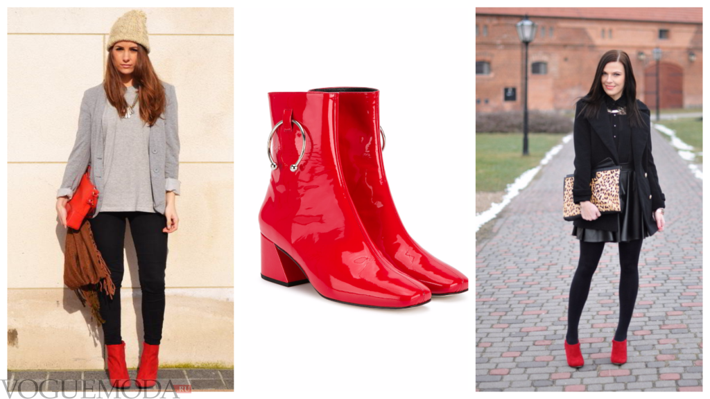 Формируя комплект, в котором будут присутствовать красные ботильоны, следует выбирать одежду, которая визуально удлинит ножки. Колористическая политика должна быть еще строже — одежда сдержанных оттенков + аксессуар из красной гаммы.