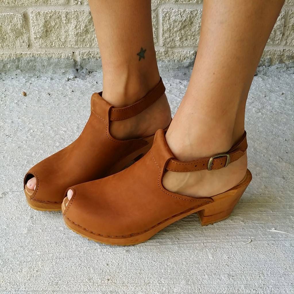 Женские сабо из натуральной кожи очень удобны за счет широкой платформы и устойчивого каблука