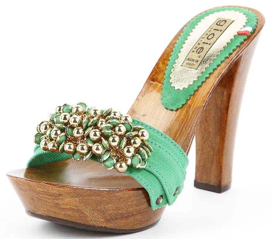 - Gioie Italiane. Итальянцы комбинируют разные материалы, украшают сабо камнями, аппликациями из кожи, перьями.