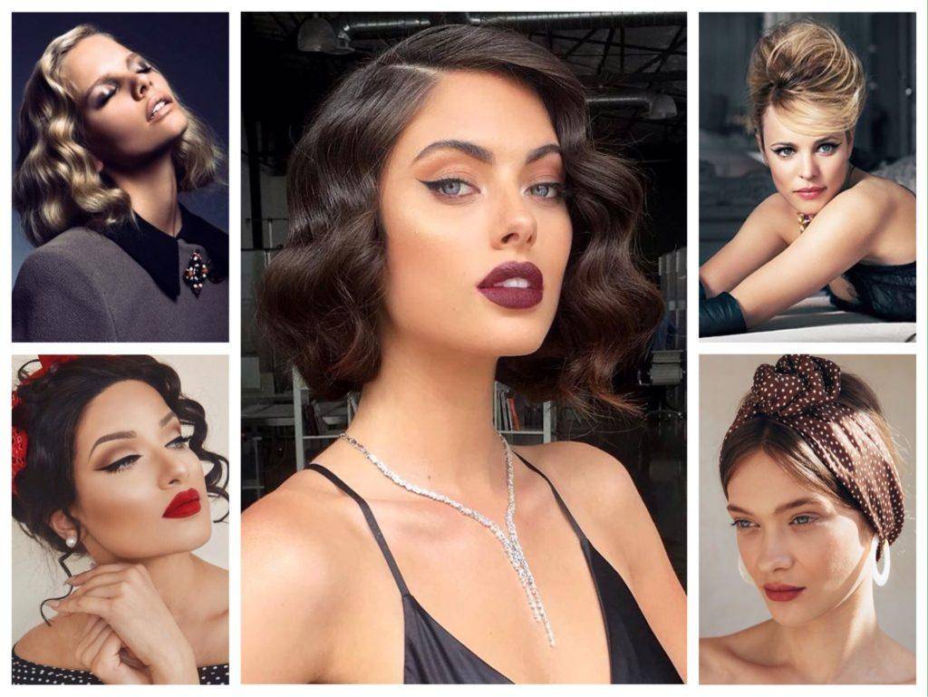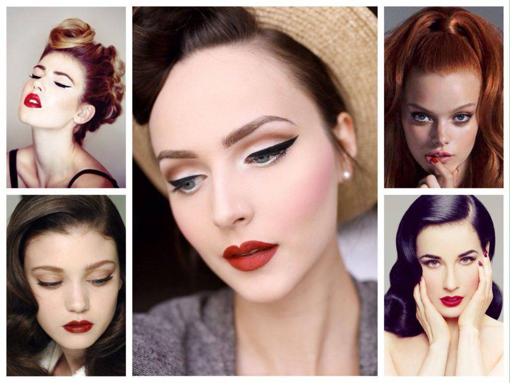 Основной акцент в макияже делается на глазах. Для их выделения можно прибегнуть к помощи накладных ресниц и графичных стрелок. Отличным решением станет подведение глаз черным карандашом. Оригинальная особенность образа ретро – мушка над губой. Для создания смелого образа допустимо использовать вишневую или алую помаду.