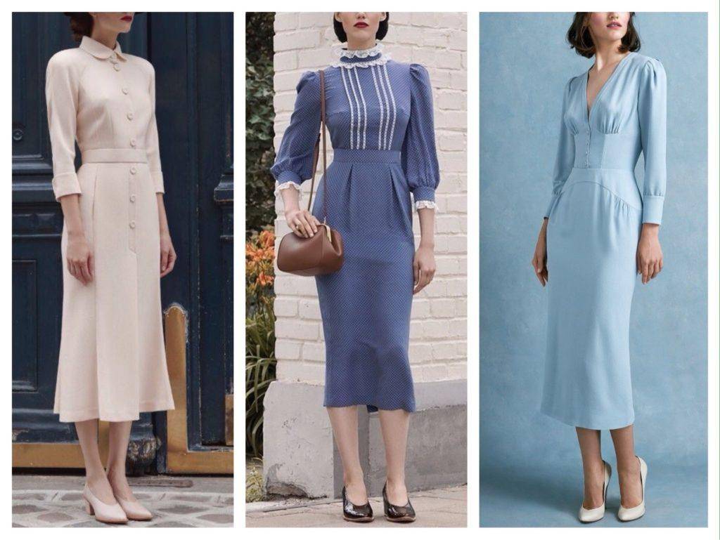 В 40-50-е годы на смену вульгарным и мужским образам пришла скромность и сдержанность. В моде – платья для женщин с прилегающим лифом, зауженной талией, с не очень глубоким декольте. Такая одежда подчеркивала изящество и женственность фигуры. Платья шили из атласа, бархата, шелка, крепдешина. Разнообразные расцветки изделий позволяли модницам выбрать желанный вариант – они были однотонными, спокойных и ярких оттенков, цветные и в горошек. К платью надевали широкий лакированный ремень, шляпы с полями, длинные перчатки до локтя, носили небольшие сумочки, которые напоминали конверт.