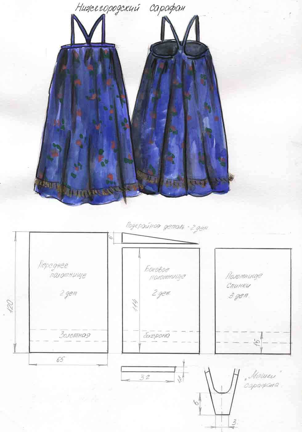 Самый древняя его модель — глухой сарафан в виде туники — изготавливался из одного загнутого пополам куска материала, образующего обе части изделия. С боков были широкие клинья.