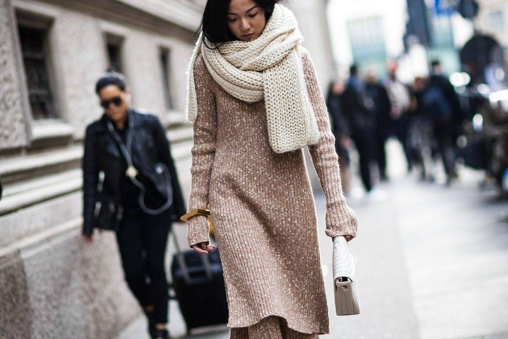 С помощью теплого платья-миди можно выстроить любой по настроению и наполненности лук. Оно идеально как для офисного, так и для уличного стилей. В последнем случае мы сочетаем его с ботильонами, кроссовками, слипонами, в первом – с жакетами и туфлями-лодочками. С чем еще носить вязаное платье до колен? С объемными шарфами, короткими куртками, пончо, интересен тандем с широкополой шляпой и сумкой-портфелем. Также вязаное платье-миди можно носить с разными по ширине и виду ремнями: с тонким лаковым, фактурным плетенным, широким трикотажным.