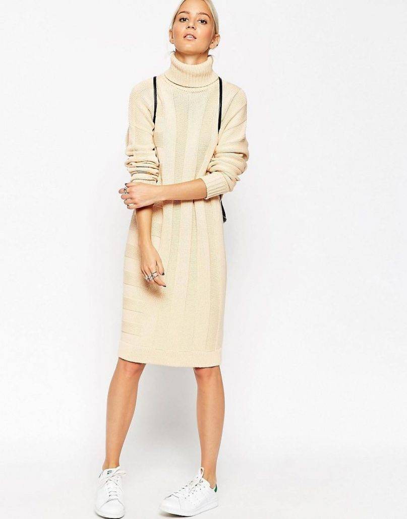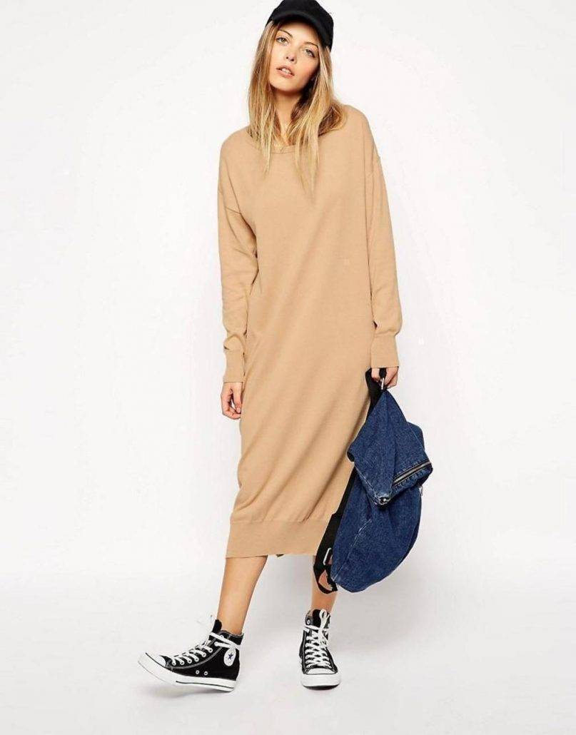 Стильным будет комбинация вязаного платья вместе со спортивной обувью. Такой вариант станет выбором спортивных молоденьких девушек, которые стремятся всегда все успевать. При выборе кроссовок или мокасин, отдавайте преимущество светлым оттенкам.