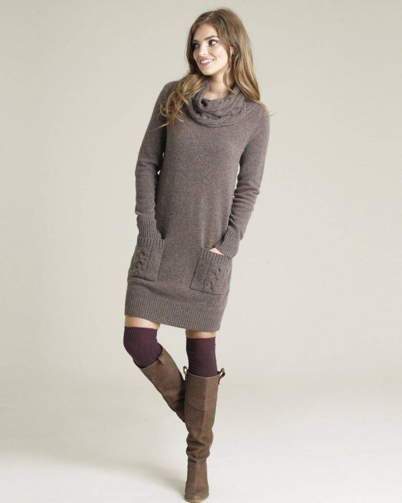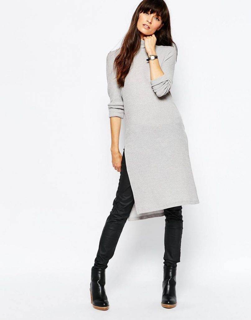 Брюки, леггинсы или брюки можно надеть вместе с вязаным платьем только в том случае, когда оно имеет мини длину и больше похоже на удлиненный свитер. При этом низ должен быть темным и плотно облегающим.