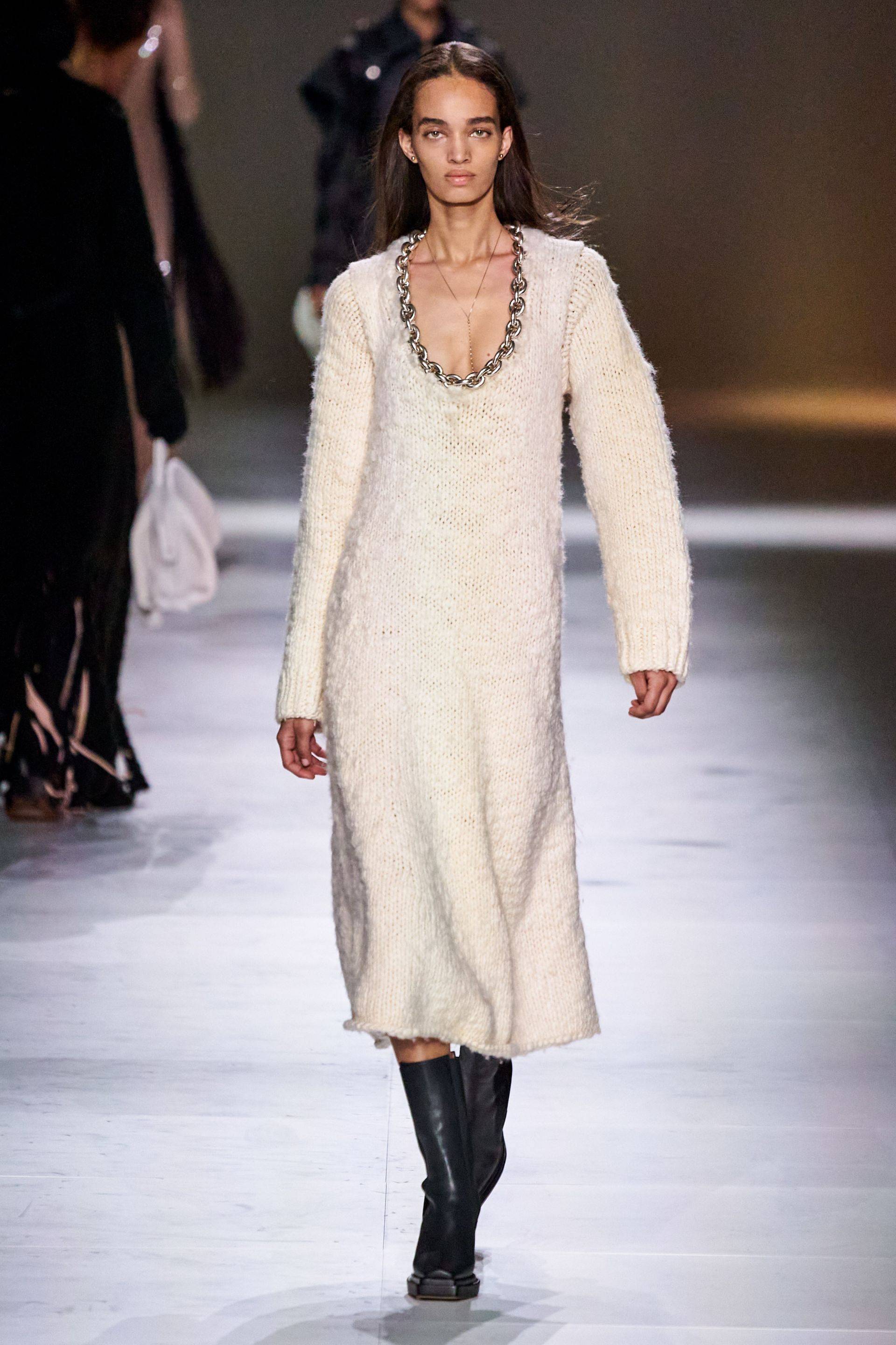 Адаптировать подиумные тренды, показанные нам на Неделях моды, на самом деле не составляет большого труда. В этом сезоне дизайнеры Bottega Veneta показали идеальное платье-свитер для повседневных прогулок и будничных дел. Прямой силуэт, свободные рукава и эффектное декольте с массивной цепью – с таким платьем точно не понадобятся дополнительные акценты и украшения.