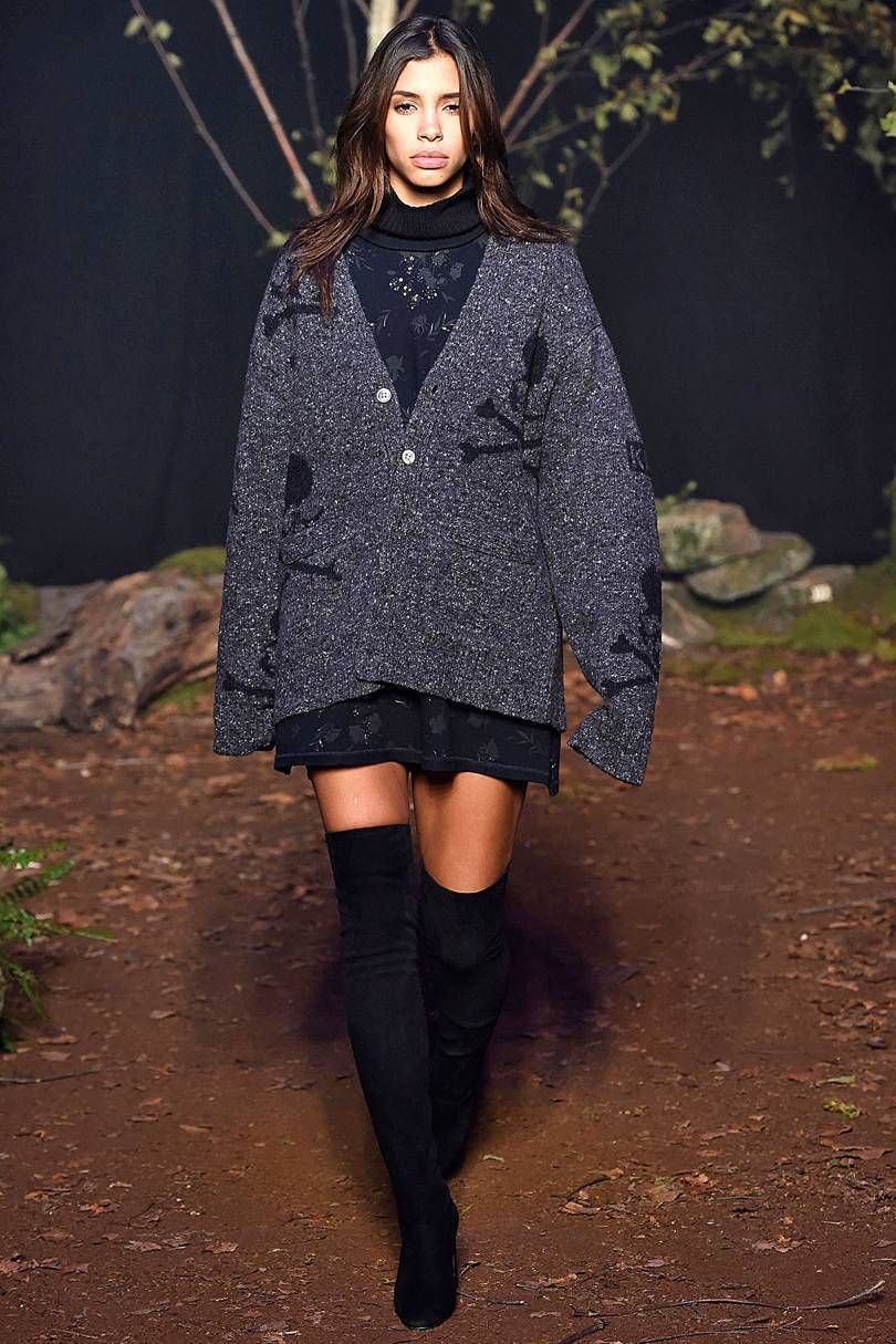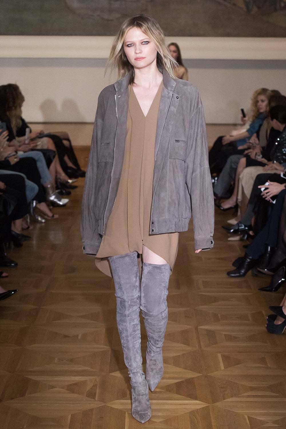 В коллекции Alexander Wang пальто в пол более лаконичные. Это изделия приталенного силуэта, с широкими плечами, выполненные из кожи и шерстяной ткани. Их предлагают носить с черной водолазкой, строгим головным убором и сапогами на каблуке.