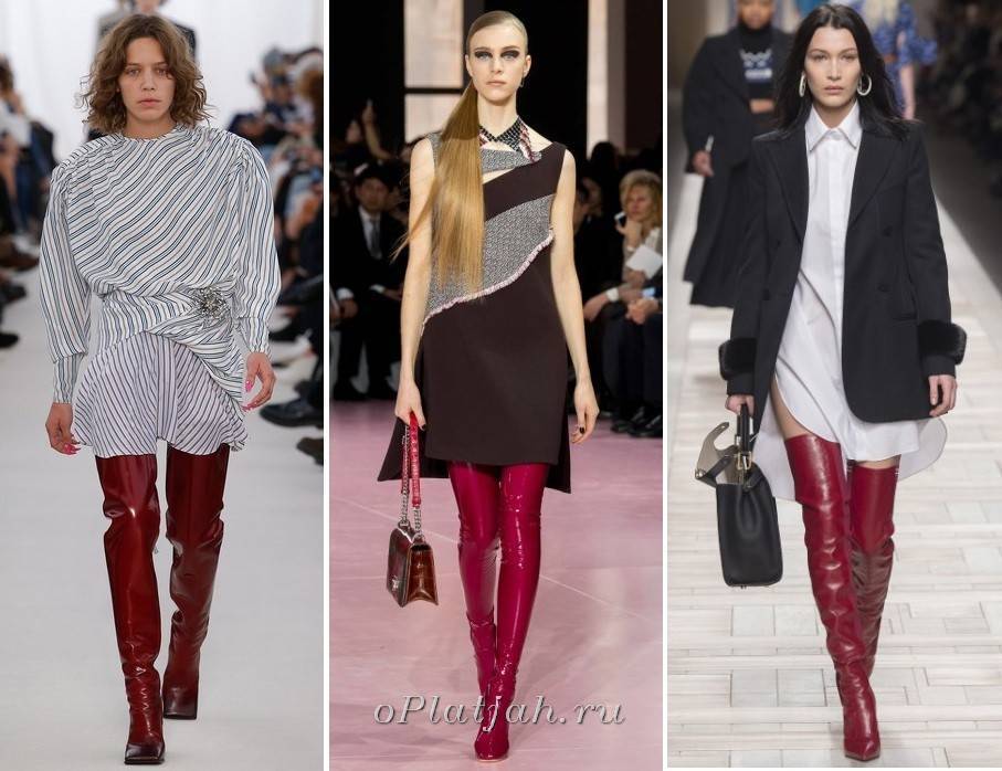 Модный тренд этого года — красные сапоги из кожи и замши, в том числе и ботфорты. Стилисты смело дополняют ими разные по цвету и фасону платьями. В первую очередь, это монолуки. Во-вторых, если хочется привнести в образ ярких красок.