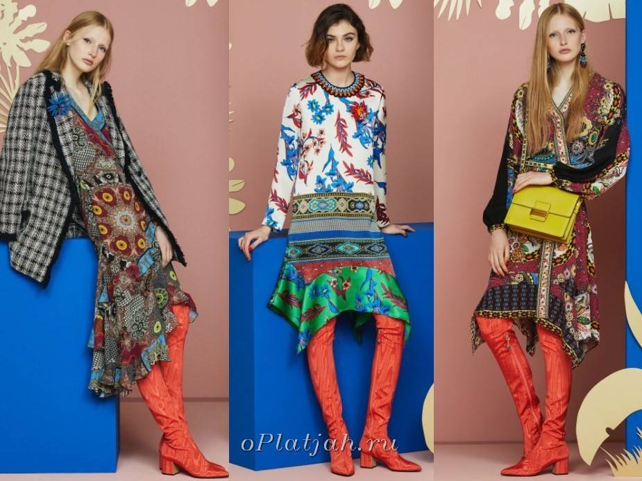Цветные платья, в узорах которых присутствуют горячие тона, как в показе от Этро, прекрасно ладят с яркими парами.