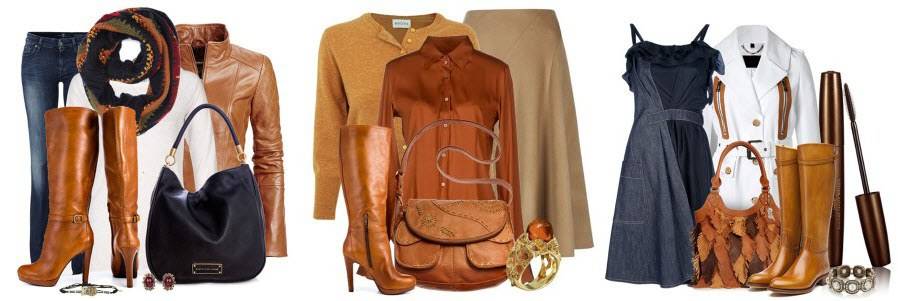 Классические коричневые кожаные сапоги требуют кожаной сумки среднего размера и классической формы, ежедневные варианты позволяют экспериментировать с кроем и размерами и сложными цветовыми сочетаниями одежды, требуя творческого подхода к выбору аксессуаров.