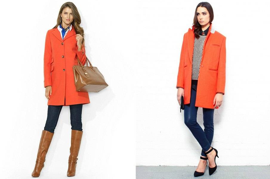 Что же касается принтованной одежды, то лучше всего подбирать к своему яркому пальто классические тельняшки с широкой полосой. Также неплохо будут смотреться столь необычные образцы верхней одежды с юбками или же штанами с разноцветным принтом, однако этот принт непременно должен содержать хотя бы один элемент оранжевого цвета или же близкого к нему кораллового оттенка. Подобные сочетания вполне уместны в вашем повседневном образе.