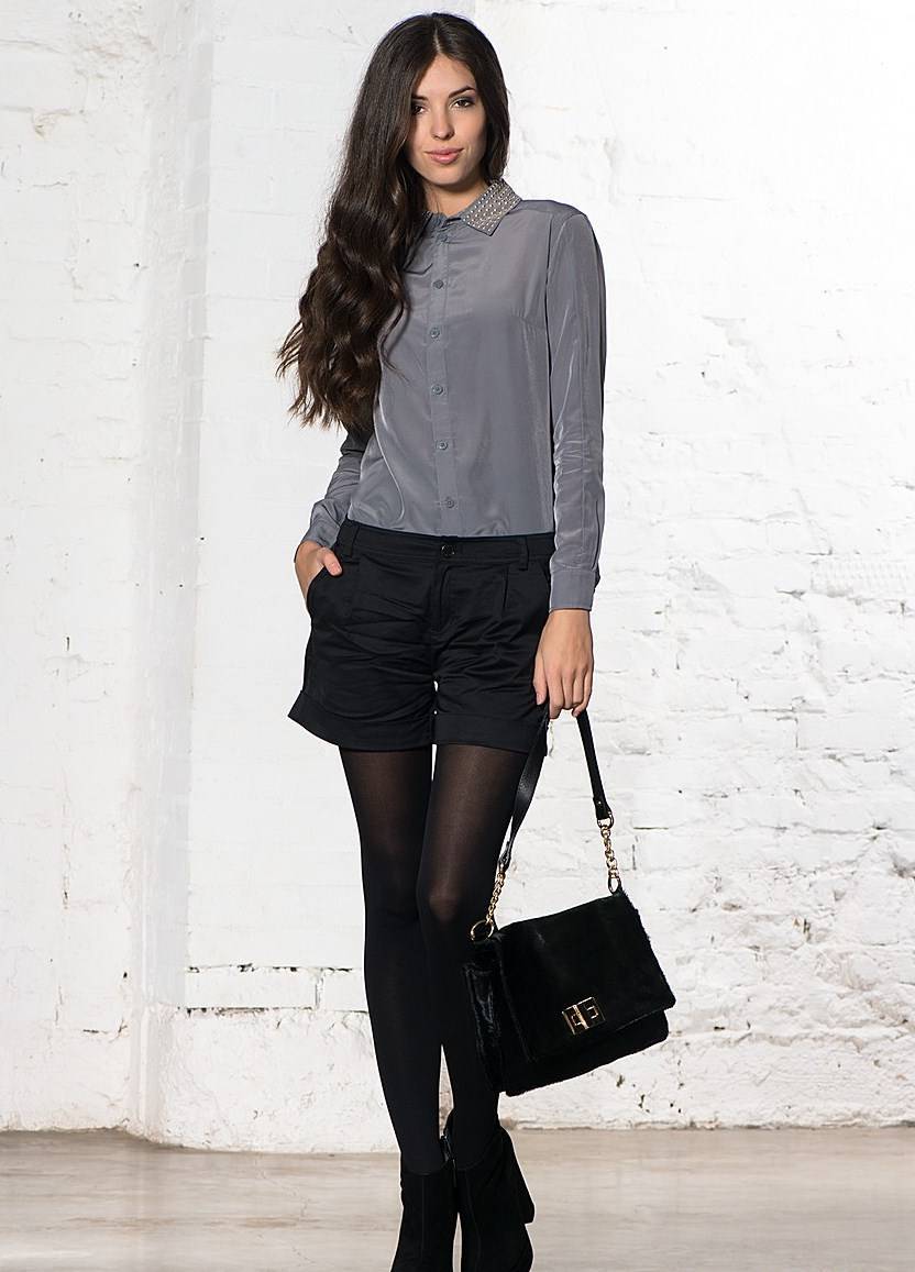 Стилисты поставили все точки над «i» и представили публике варианты комбинирования плотных шорт и темных колготок. Это незаменимое сочетание для осеннего и зимнего лука. Колготки визуально удлиняют ноги, особенно если они выполнены с каким-нибудь эффектом (к примеру, блики).